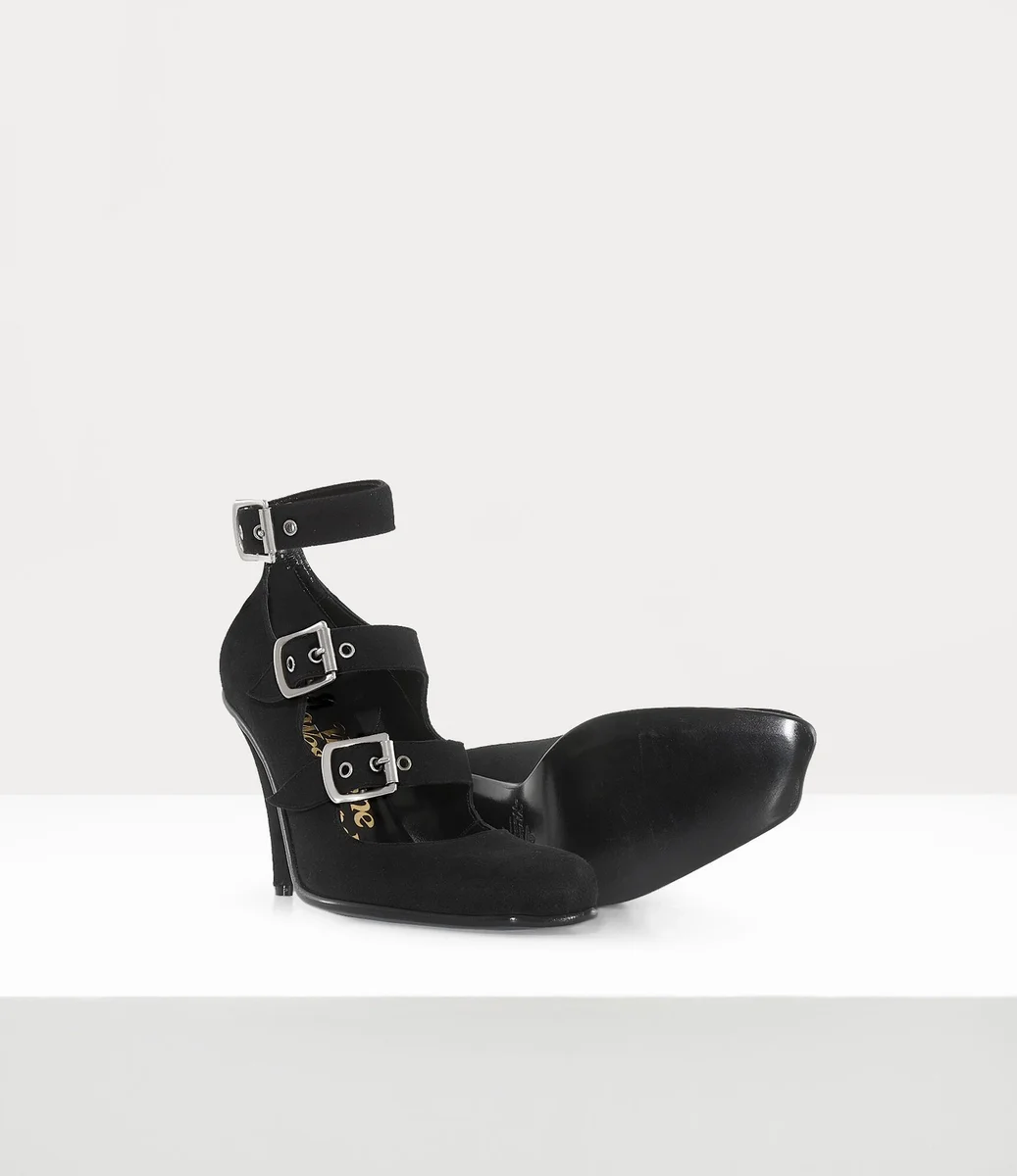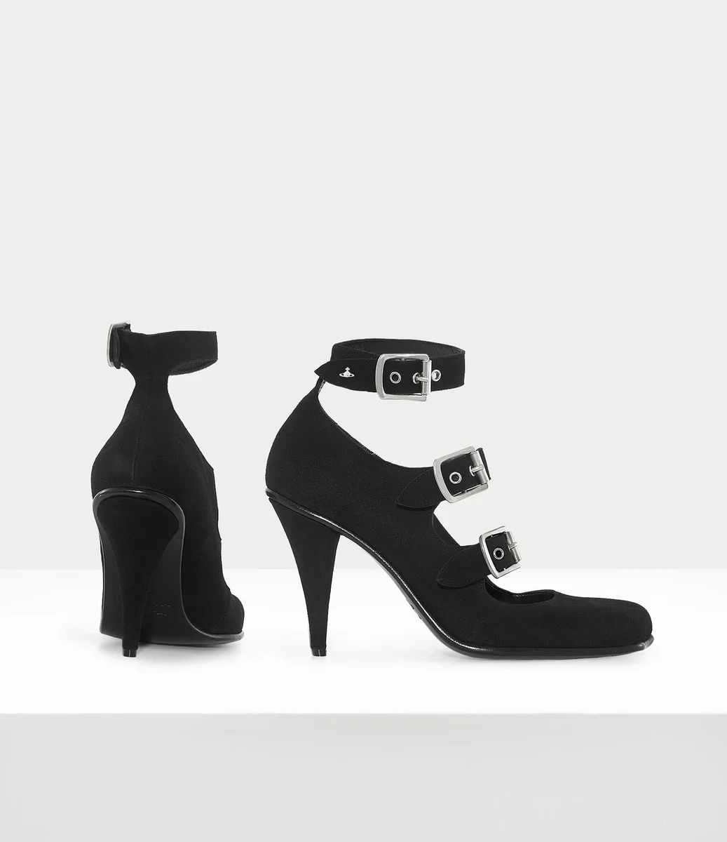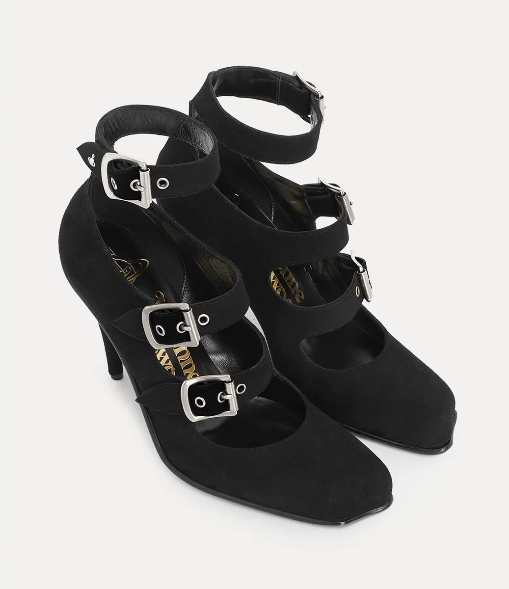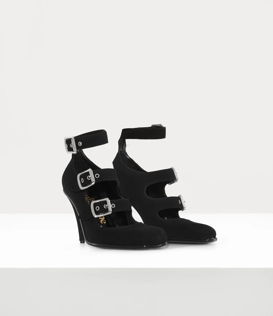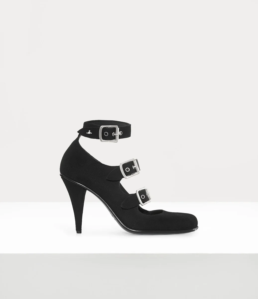 Los tacones Savage de Vivienne Westwood están confeccionados en piel de ante, con acabados metálicos en tono plateado y el motivo Orb en la correa del diseño.
